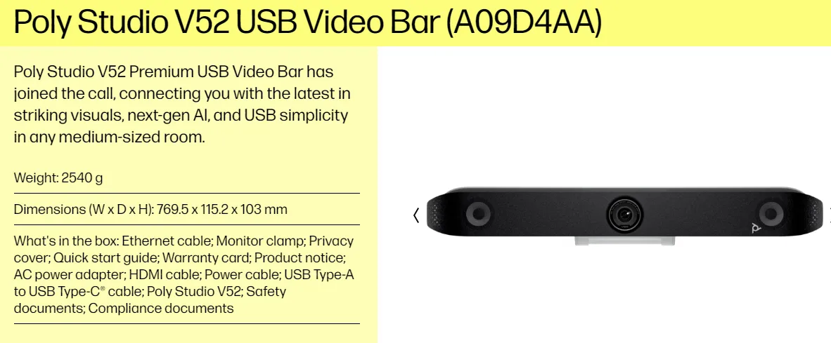 🎥 Poly Studio V52 USB Video Bar (A09D4AA)